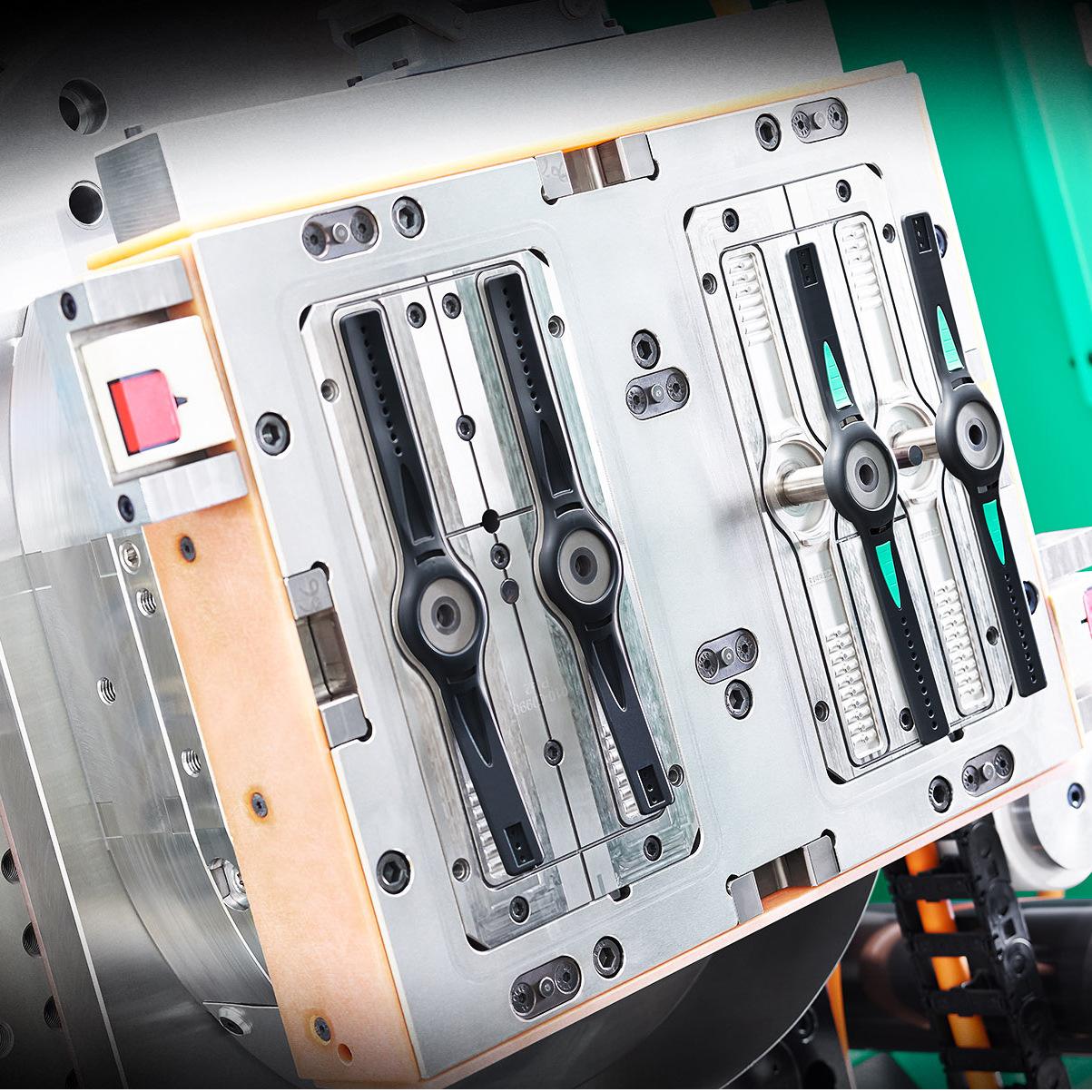 雙色表帶注射成型通過模具合模后先注射單邊顏色完成注塑成型后,將模芯替換在進(jìn)行二次注射成型達(dá)到雙色效果,同時(shí)達(dá)到完全不分色不分線的效果。