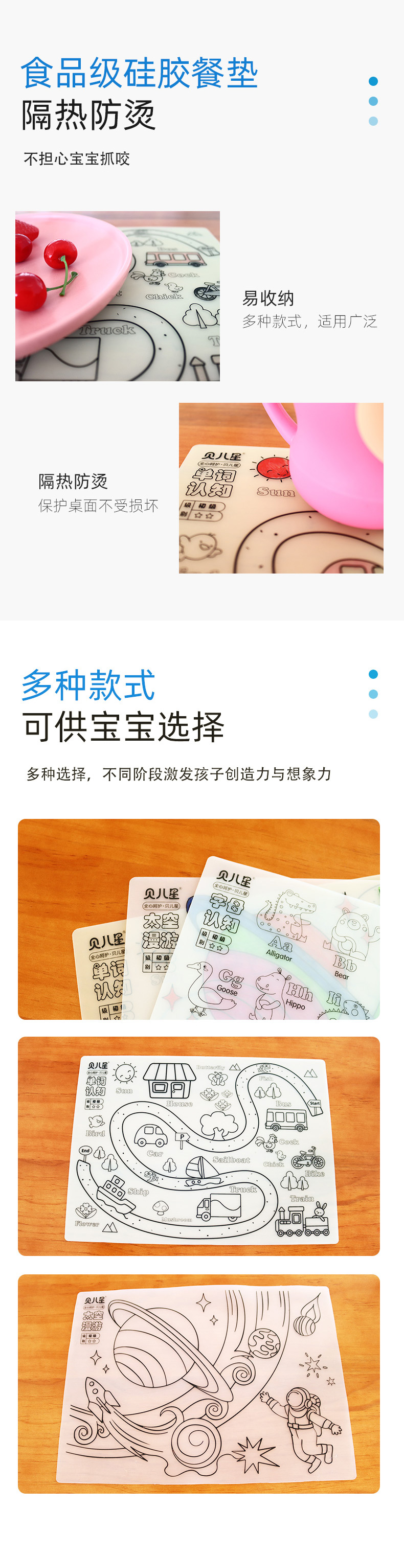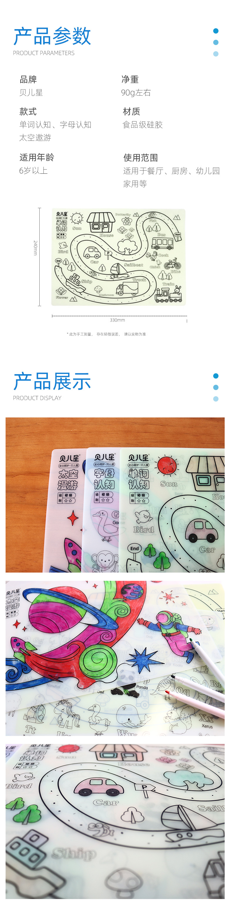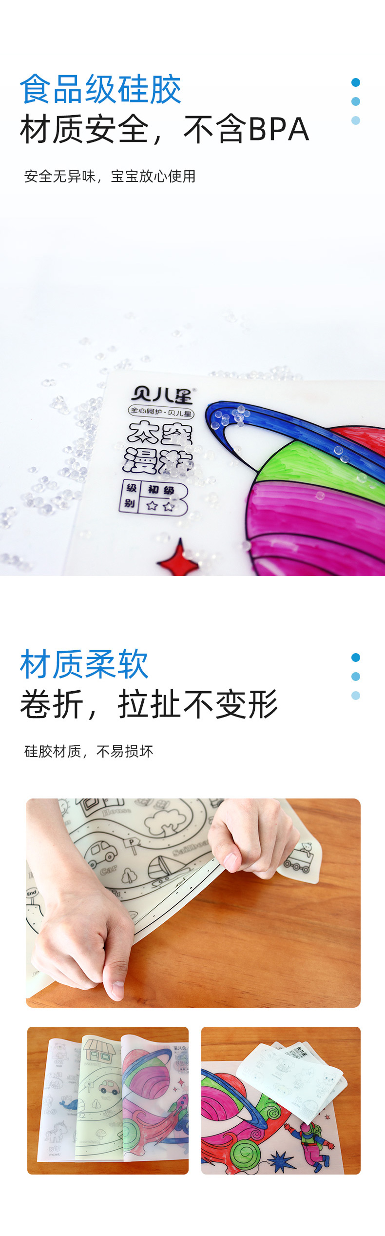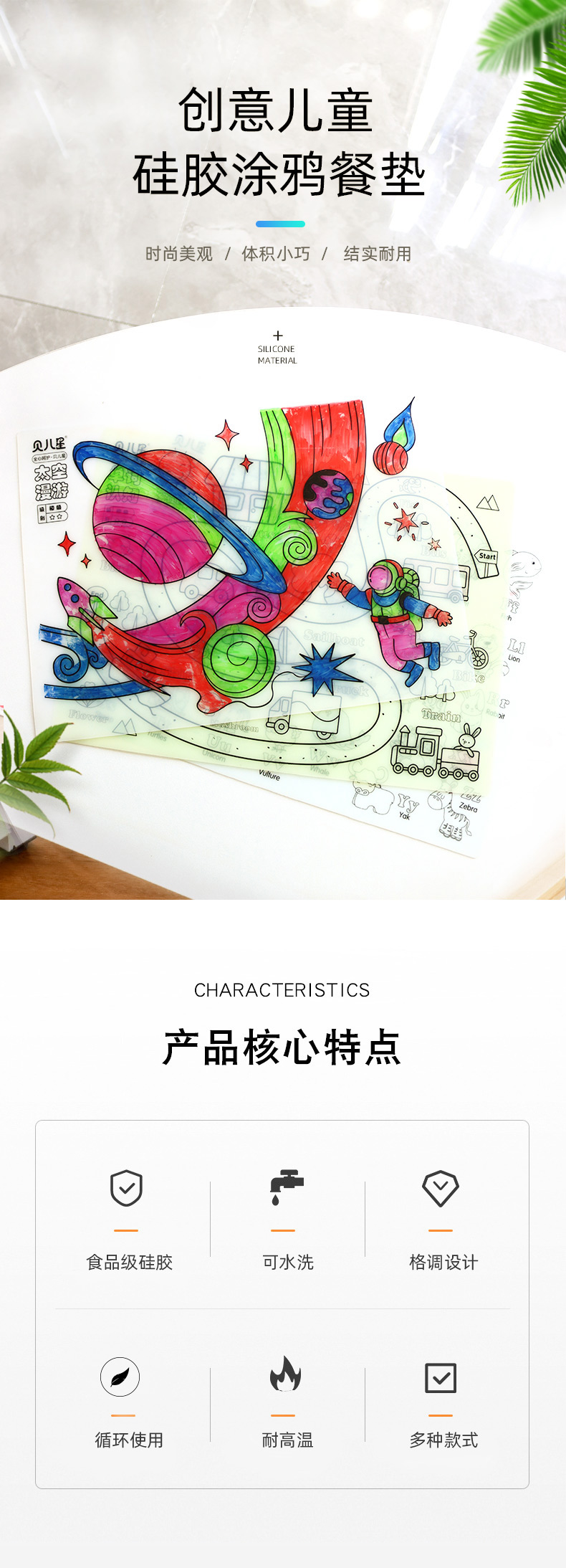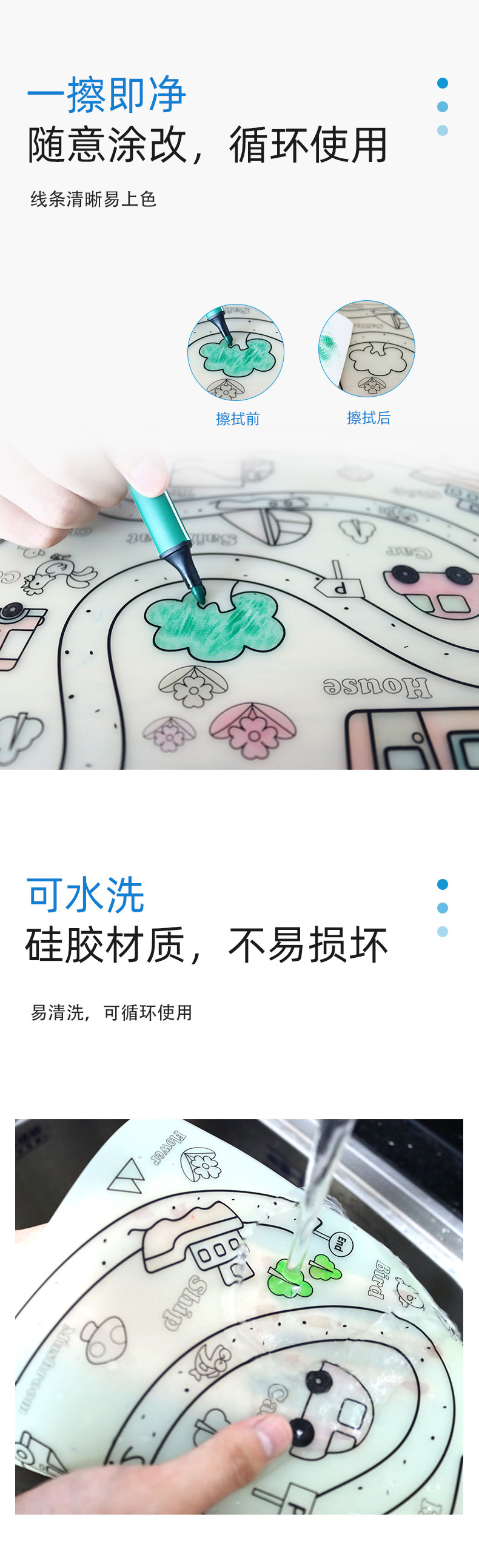 硅膠涂鴉畫板產(chǎn)品的主要買點源于產(chǎn)品的表面圖案以及配套的創(chuàng)意,產(chǎn)品從6-12歲之間具有不同的主題與認(rèn)知圖案,可以連接整體進(jìn)行學(xué)習(xí)提升大腦開發(fā),加強兒童動手能力以及創(chuàng)新創(chuàng)作能力,此外產(chǎn)品配比水性可清洗彩色筆,不會對硅膠表面產(chǎn)生筆污以及筆畫痕跡,材料屬于柔軟回彈食品級硅膠,所以硅膠店鋪可以任意曲折來回折疊不會變形損壞,此外硅膠墊片可水性可隔熱,可耐高低溫,可以在多個行業(yè)領(lǐng)域當(dāng)中運用!