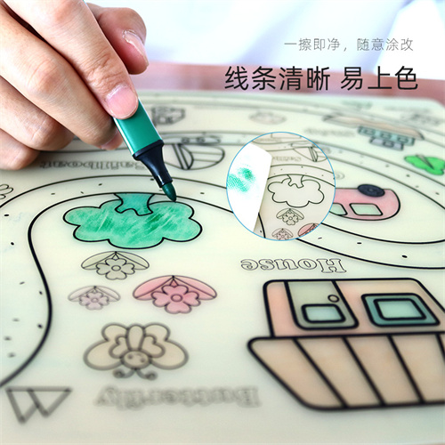 材料環(huán)保柔軟,硅膠墊廠家采用優(yōu)質(zhì)食品級硅膠材料生產(chǎn)加工,經(jīng)過高溫200度將模紙轉(zhuǎn)印二次成型達(dá)到表面底色圖案效果,過200度高溫具有優(yōu)良附著力,多種創(chuàng)作思維底色圖案,可鍛煉兒童的思維能力以及創(chuàng)作能力,優(yōu)質(zhì)水性筆不留筆污色痕,可可隨意涂改反復(fù)使用,反復(fù)涂鴉!